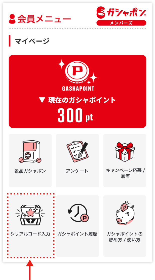 ガッチャモールで手に入れたガシャポイントクーポンはガシャポン®メンバーズのマイページにある「シリアルコード入力」から入力することで付与されます。