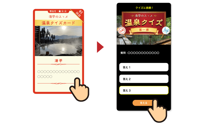 湯学のスゝメ」ガッチャ!をプレイすると、「クイズカード」または「レアカード」が当たります。