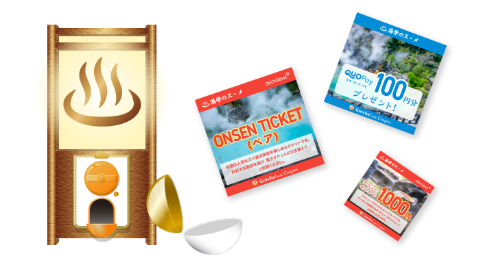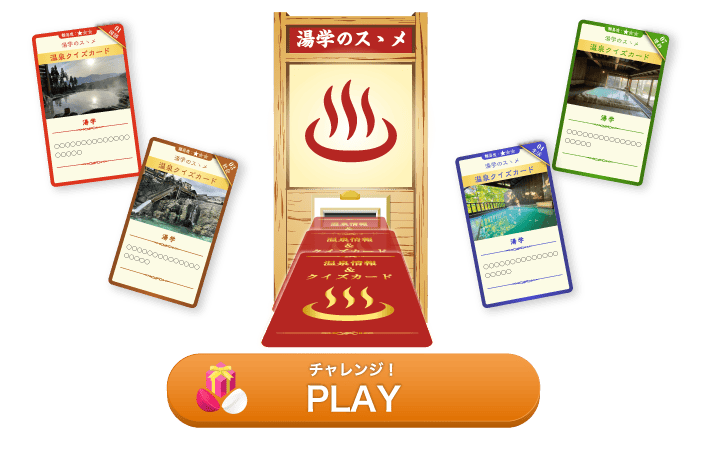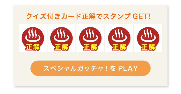 温泉について学べるクイズに挑戦し、5問正解するごとに、旅行券やお買い物券などが当たる「スペシャルガッチャ!」にチャレンジできるサービスです。温泉の知識を深めながら、お得な体験をお楽しみください。