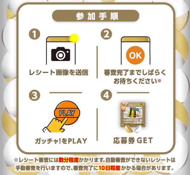 レシート及び商品画像に不備があった場合はお知らせが届きませんのでご了承ください。不備理由は、レシート登録画面でご確認ください。